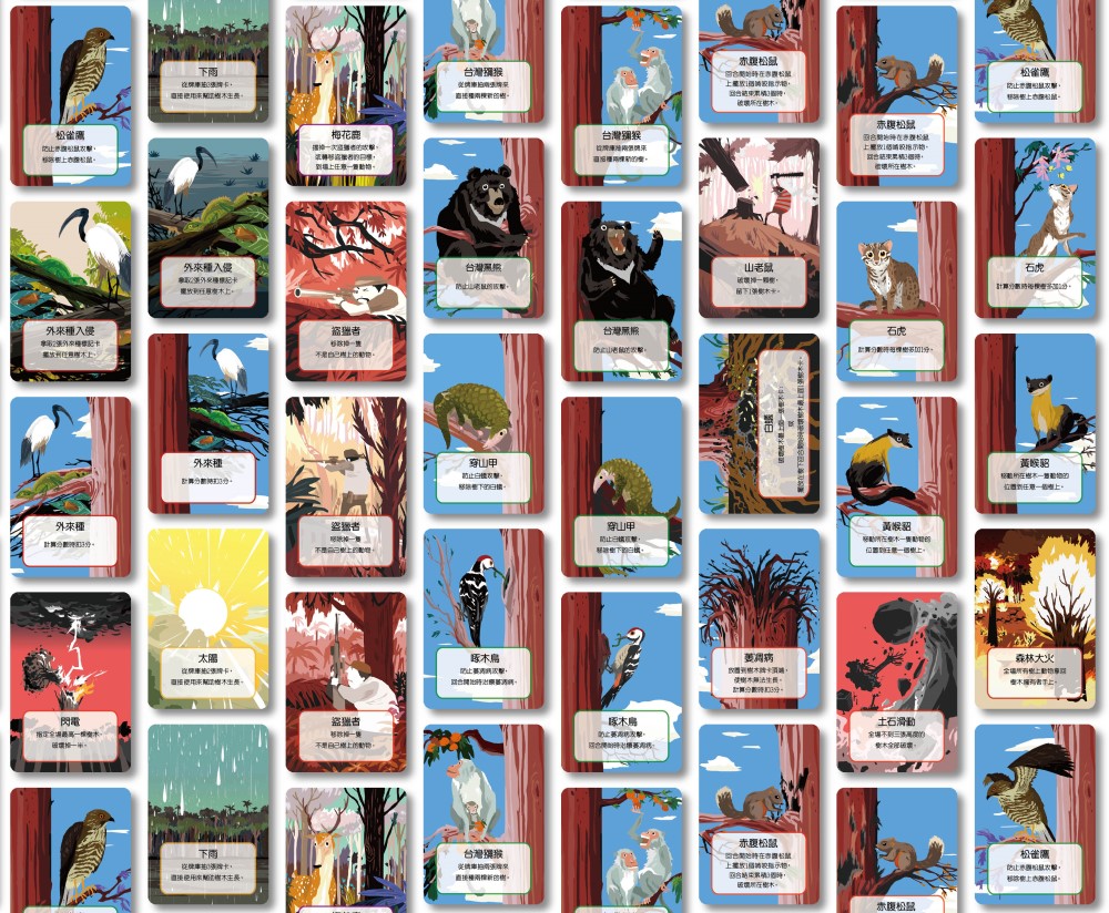 牌卡裡面的動物角色有台灣黑熊、赤腹松鼠、台灣獼猴、