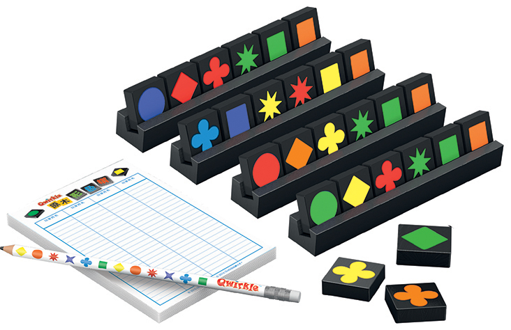 原木形色棋 (10周年紀念版) 桌上遊戲包含108個木製形色棋,此外更有四個特別的木製收納架,一隻Qwirkle紀念鉛筆,與精巧別緻的計分本。