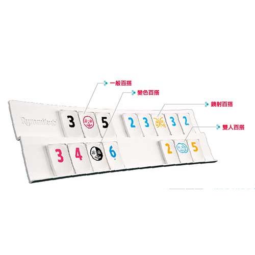 配件: 112塊塑膠拉密牌(含8塊百搭)、4個牌架、説明書
