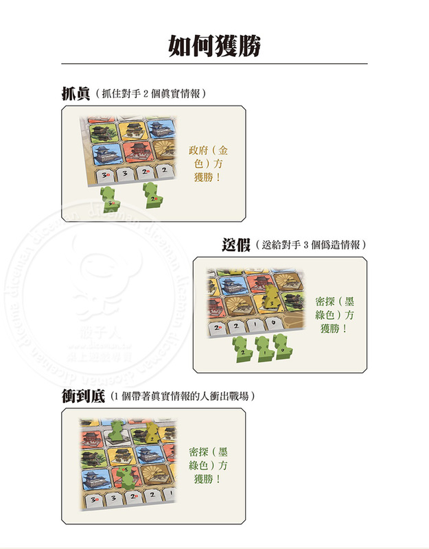 身為密探方或是政府方的作戰指揮官,玩家的目標是命令手下的情報員在花見小路這塊地區上偵查,護送己方握有關鍵情報的成員離開,同時也伺機搜索並奪取對手的關鍵情報。藉由移動、打鬥與諜報戰術的運用,玩家能夠以3種不同的策略來取勝。適合所有初、中、高階玩家,可依遊戲經驗作難易度的調整,讓新手與老手玩家都能同桌共樂。