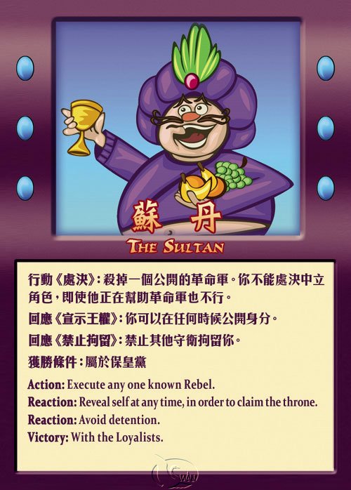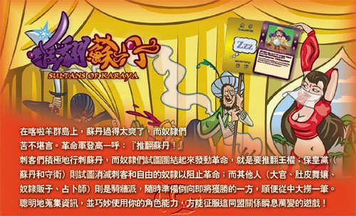 在喀啦羊群島上,蘇丹過得太爽了,而奴隸們苦不堪言。革命軍登高一呼:『推翻蘇丹!』,刺客們積極地行刺蘇丹,而奴隸們試圖團結起來發動革命,就是要推翻王權;保皇黨(蘇丹和守衛)則試圖消滅刺客和自由的奴隸以阻止革命;而其他人(大官、肚皮舞孃、奴隸販子、占卜師)則是騎牆派,隨時準備倒向即將獲勝的一方,順便從中大撈一筆。聰明地蒐集資訊,並巧妙使用你的角色能力,方能征服這同盟關係瞬息萬變的遊戲!