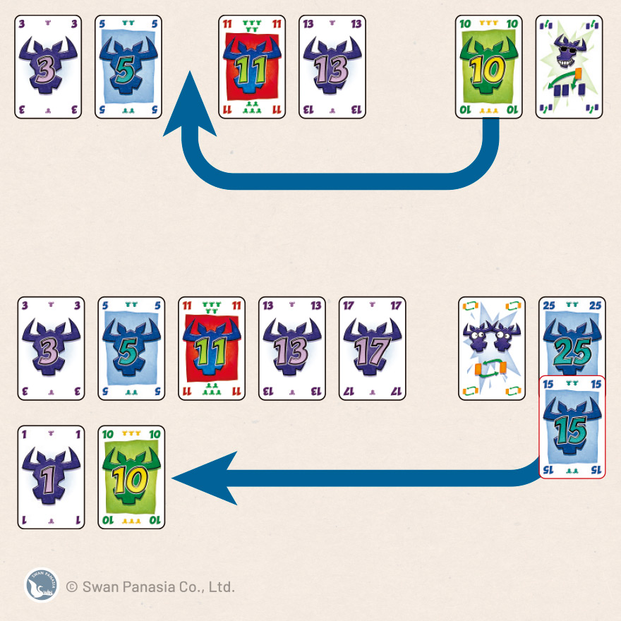 玩家各有10張手牌,每回合同時打出1張,必須將它們接到牌陣中的1列尾端。