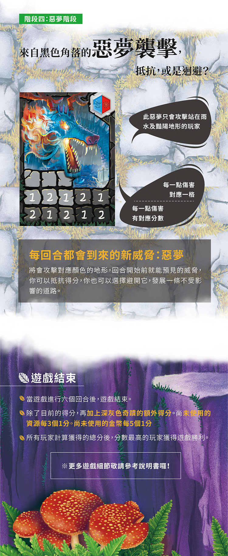 依順序,所有玩家檢查自己的幫手(領袖也算),是否站在惡夢怪獸對應的地形上,如果有,則受到該怪獸的攻擊。