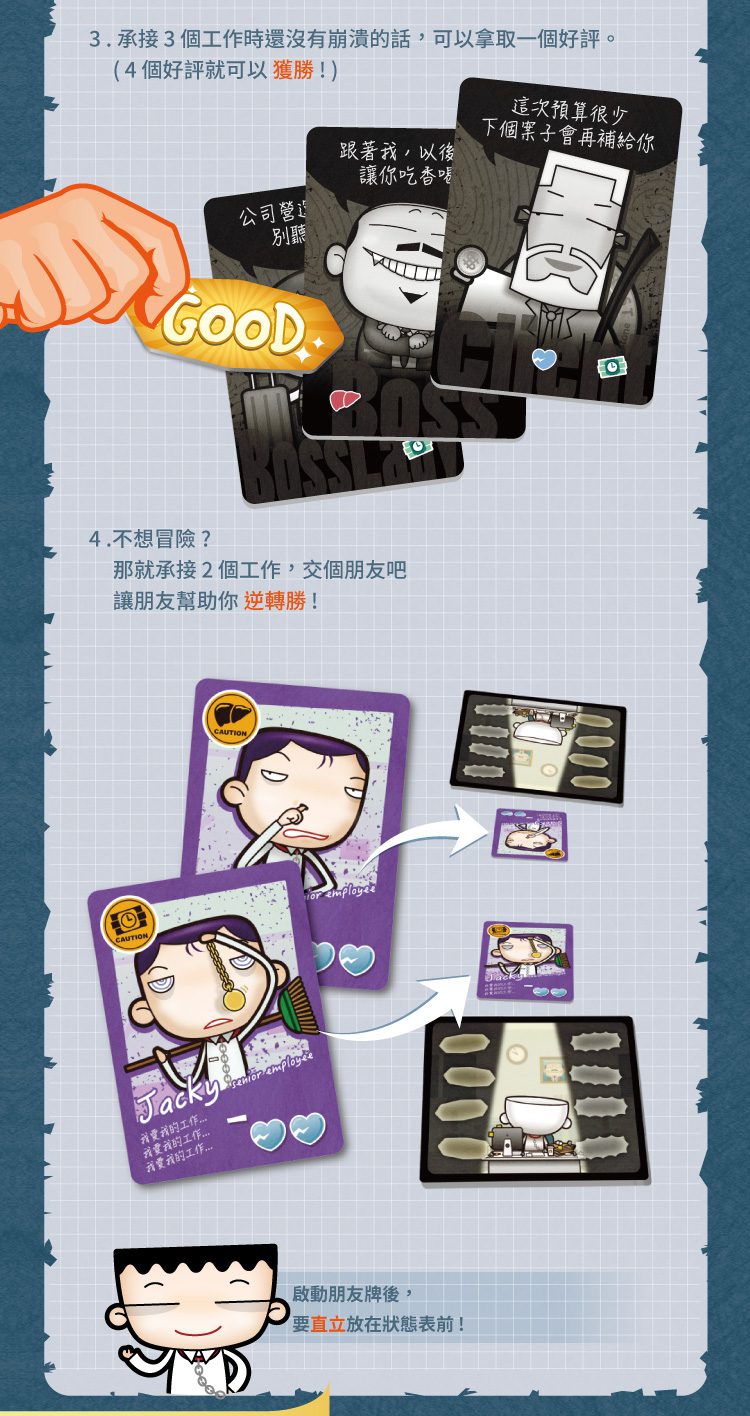 這場充滿風險的職場遊戲,打開下一份工作的瞬間,都像是走鋼索的旅程, 崩潰的那一刻除了靠背老闆,還可以靠誰? 道路上也許能遇到同病相憐,同仇敵愾的職場好朋友, 雖然不知道他們什麼時候就突然變心, 但在擁有友誼的時刻把握時機,就一鼓作氣拿下眾人的讚賞..……嗎? 或者,崩潰的你,只能接受老鳥們的訕笑呢?