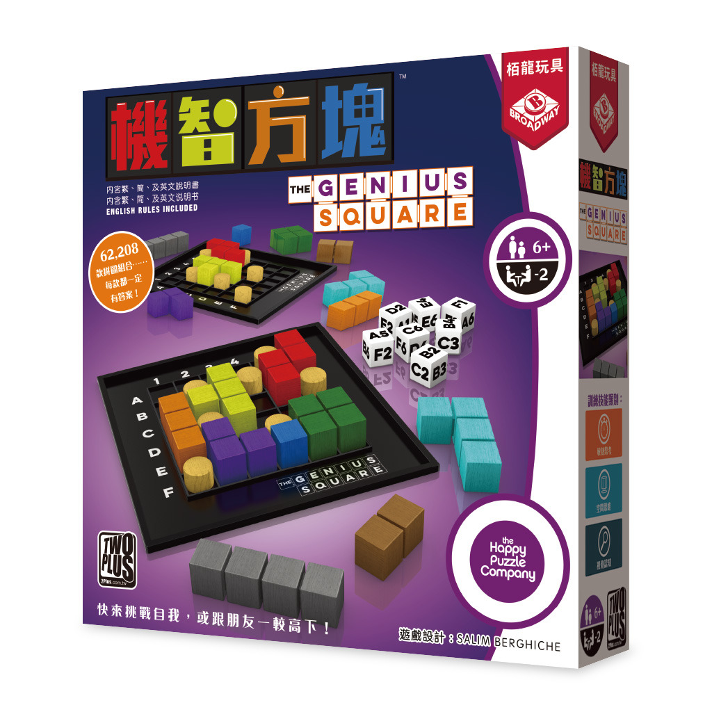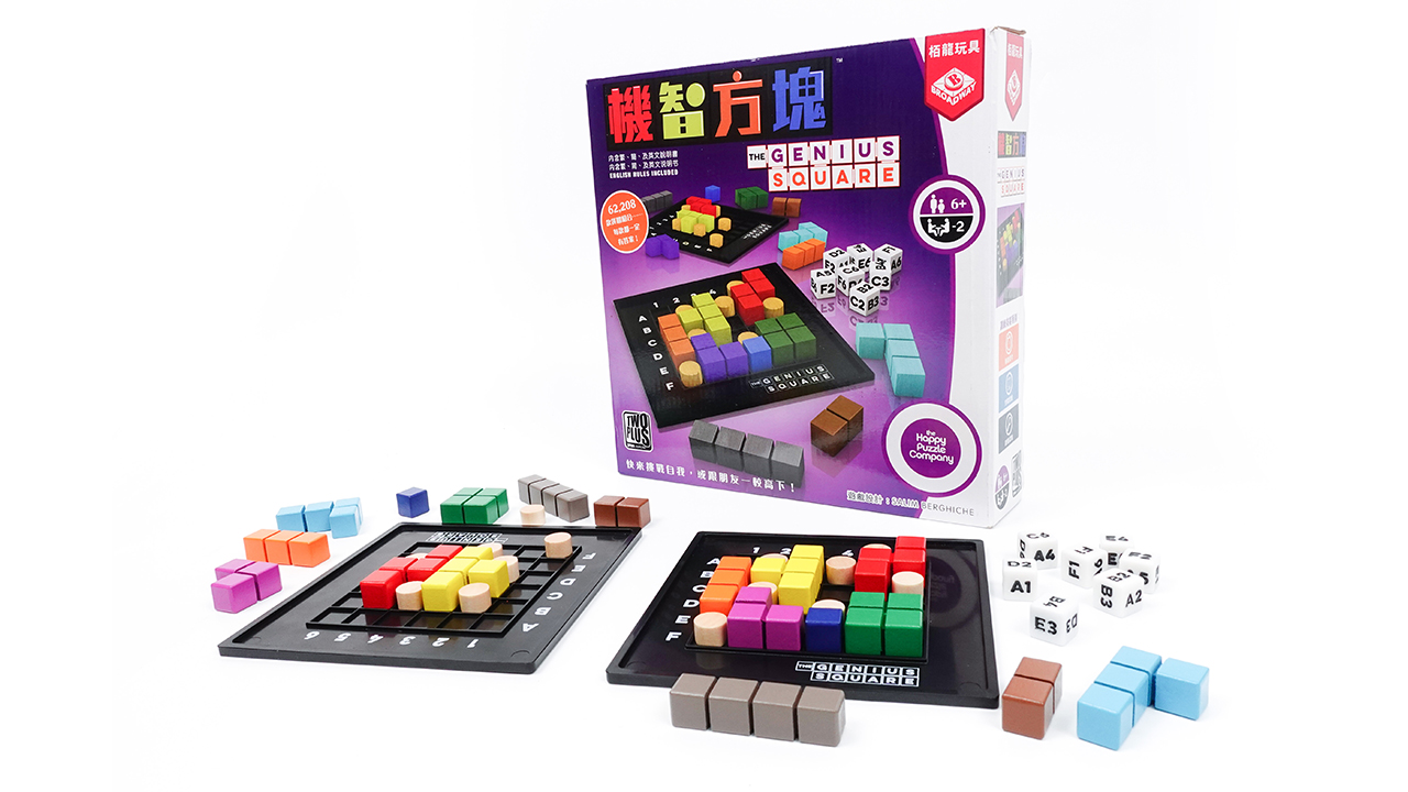 遊戲版圖 x 2、彩色積木(各9塊) x 2、柱子棋(各7塊) x 2、骰子 x 7