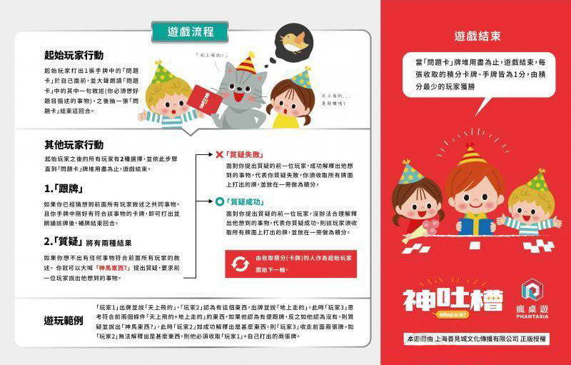 b質疑:如果你覺得或想不出來有什麼答案符合前面所有玩家出的卡片,那你就大喊「神馬東西!」,提出質疑並要求上一位玩家說出他的答案!
