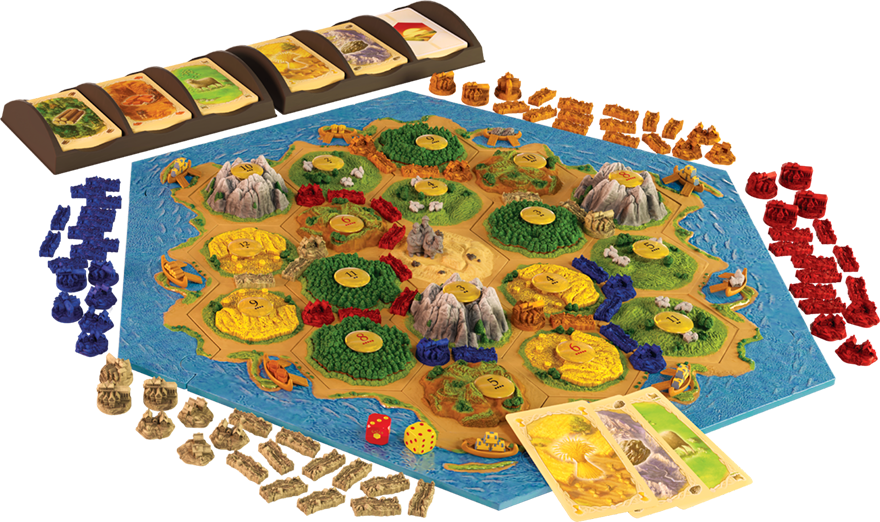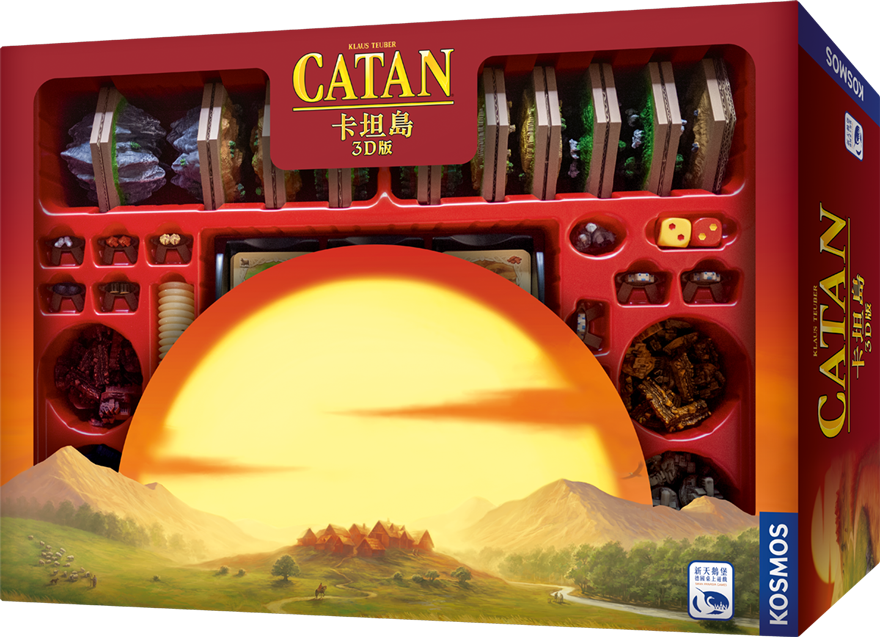 本次發行的全新3D版本,結合新的3D模型技術及更優質的印刷製作,不僅地形板塊,連同海洋外圍板塊、象徵交易的港口,均為手工上色的3D模型!強盜、客製化的骰子,玩家的村莊、城市與道路,加起來一共170個模型,一次滿足全球卡坦島迷對3D桌遊的期待。