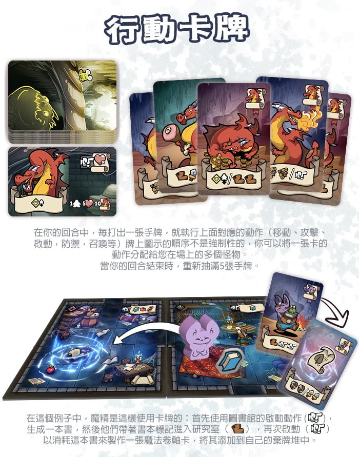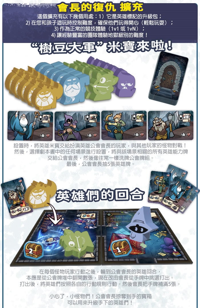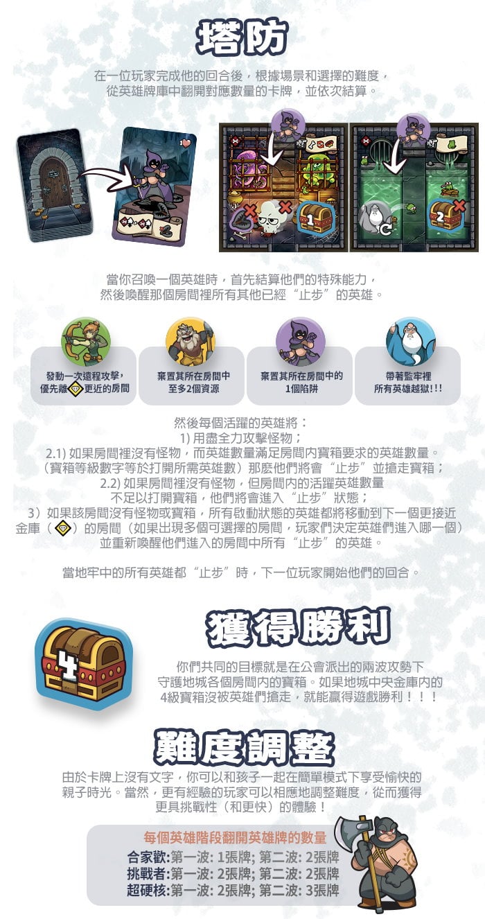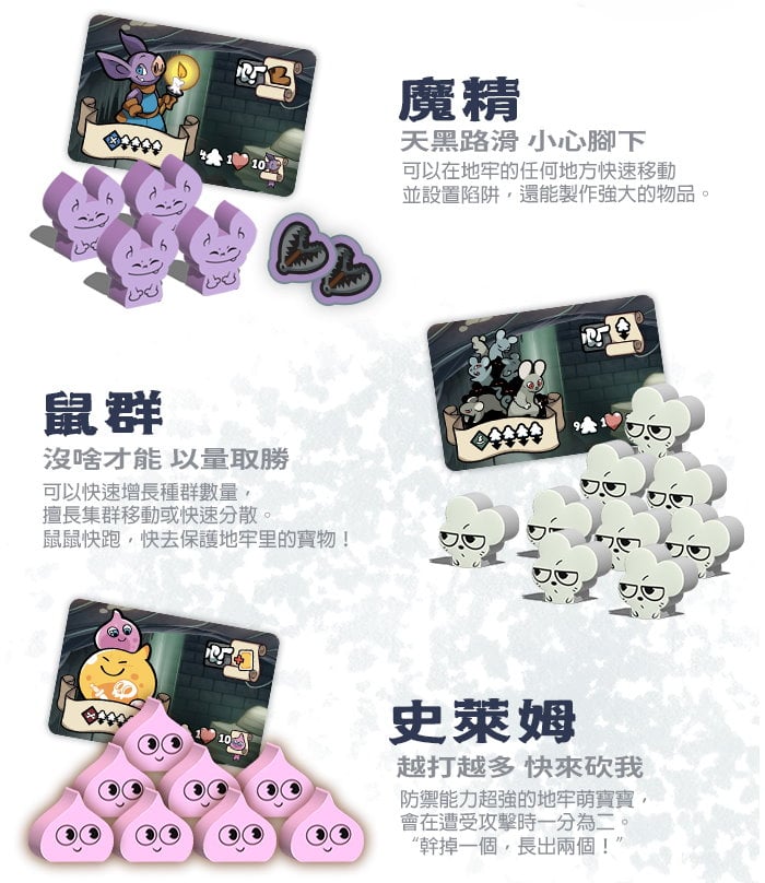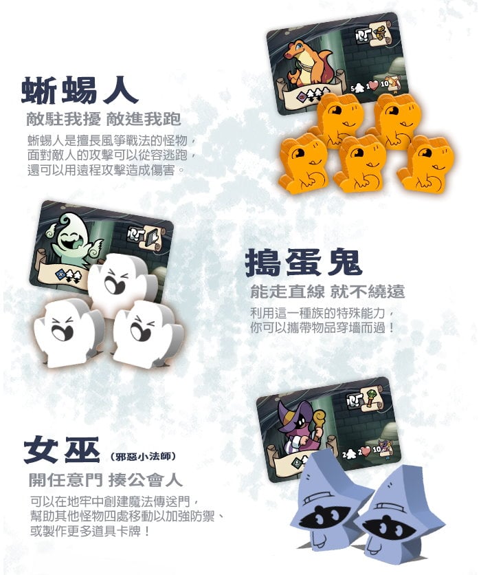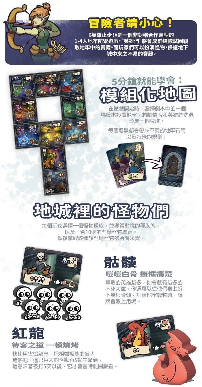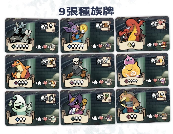 在超快的節奏中,英雄會用很快的速度跟你比行動,讓整個過程充滿了緊迫感,這是一個非常歡樂的卡牌驅動合作遊戲。每個種族都有自己的能力喔,我們要善用它們的能力,讓適合的怪物去防守英雄們喔 !