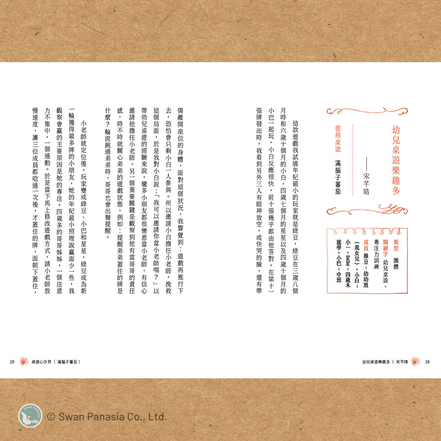 「桌遊助人趣」以教案方式呈現,猶如骨架,而「桌遊心世界」以敘說對話的方式鋪陳,猶如血肉。