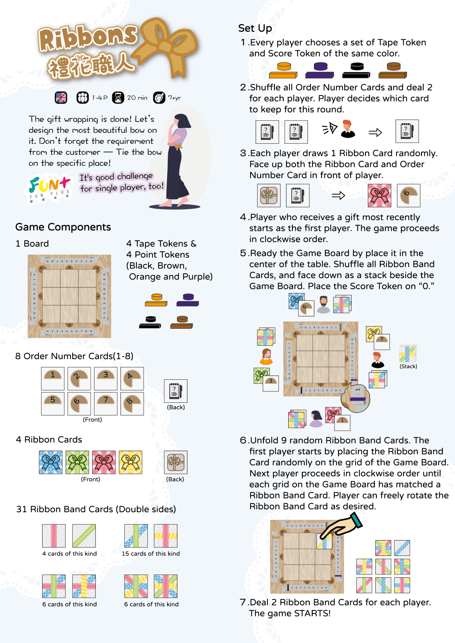 並且要在遊戲過程當中運用旋轉、翻轉、交換與替換卡片的方式,讓自己的緞帶花色在指定的位置上形成2個緞帶的交會,就可以完成蝴蝶結囉!
