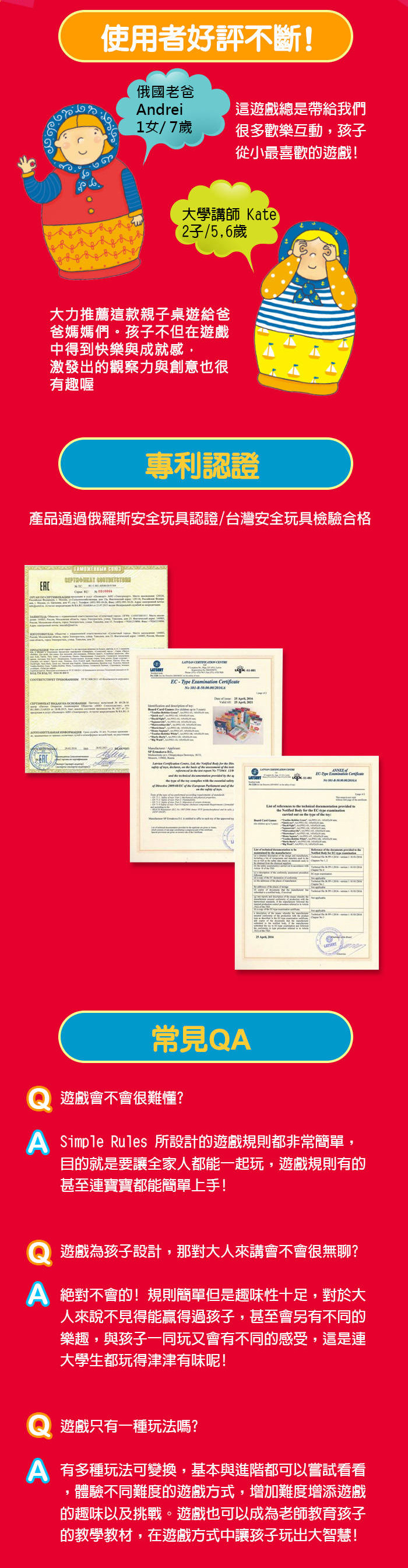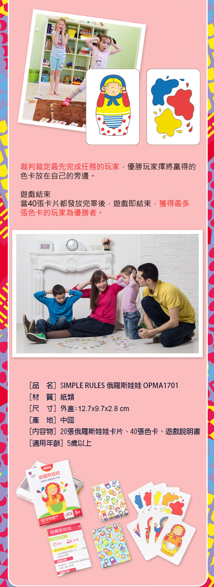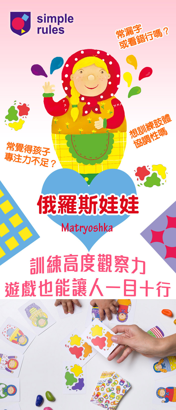 俄羅斯娃娃是一個位小朋友量身打造的桌遊;遊戲期間,玩家無須輪流等待,大家一同找出擁有與色卡上顏色一樣的俄羅斯娃娃,並模仿娃娃的動作,沉浸在遊戲中,同時培養注意力及專注力,並且加速孩子的反應力!