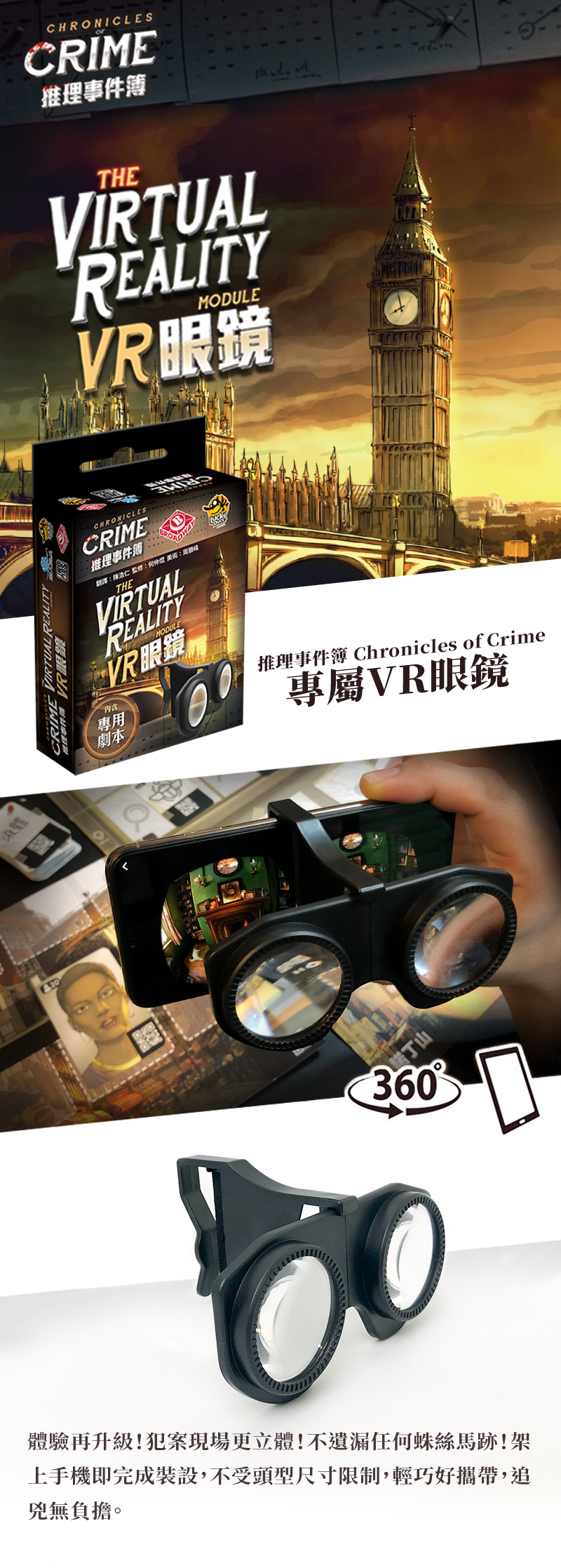 《推理事件簿》遊戲體驗再升級!VR眼鏡讓犯案現場更加立體,不錯過兇手遺留的蛛絲馬跡!架上手機即完成裝設,手持設計不受頭型尺寸限制,輕巧好攜帶,讓你追兇無負擔。本擴充搭配《推理事件簿》應用程式綁定帳號後,還可免費下載一個額外劇本!