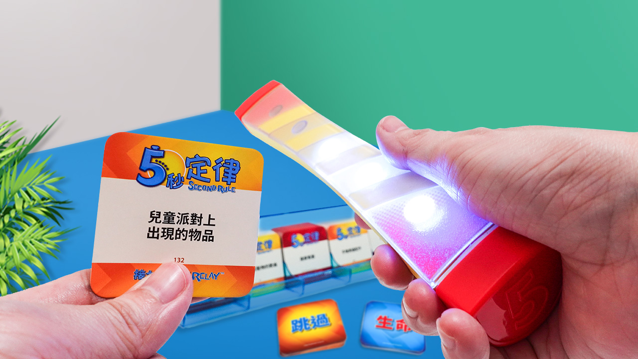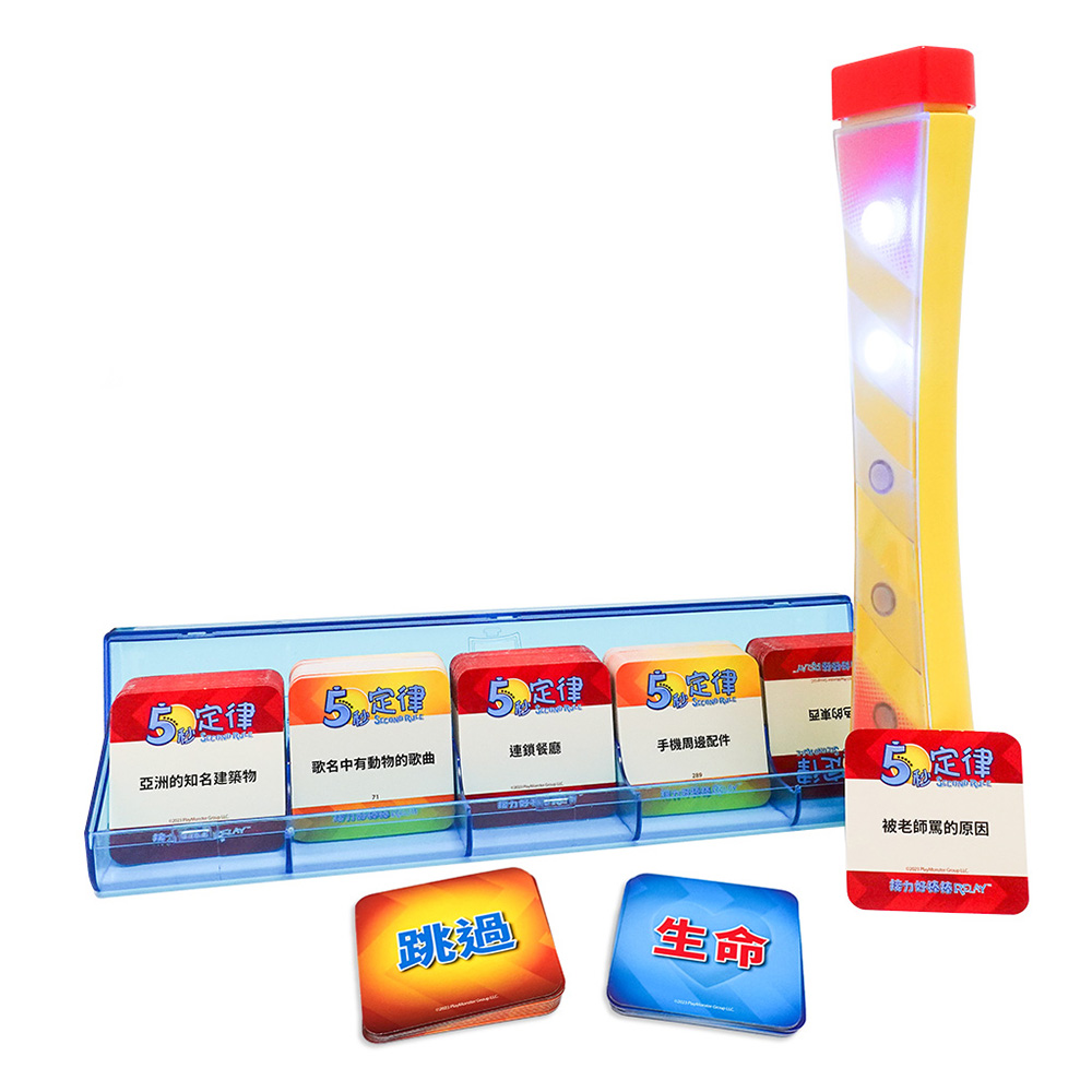 五秒定律科技大升級!這次推出了聲光特效絕佳的接力棒,玩家只要喊出答案,然後將棒子交給下一位玩家,棒子就會自動感應開始5秒倒數,說出答案交棒或者使用功能卡躲避,誰會是腦力枯竭的最後一棒呢?