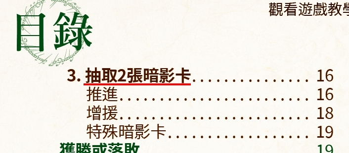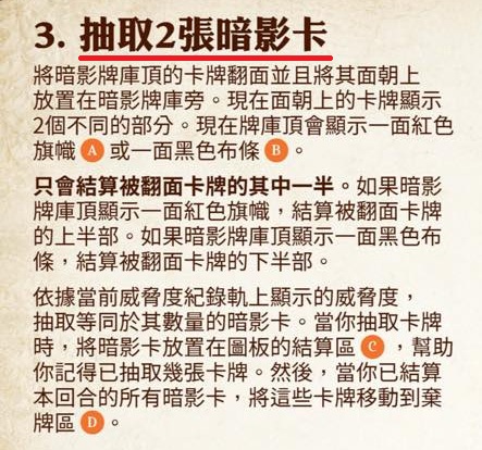感謝臉書熱心玩家告知,特此說明規則書P2和P16的標題「抽取2張暗影卡」為誤植,正確敘述為「抽取暗影卡」