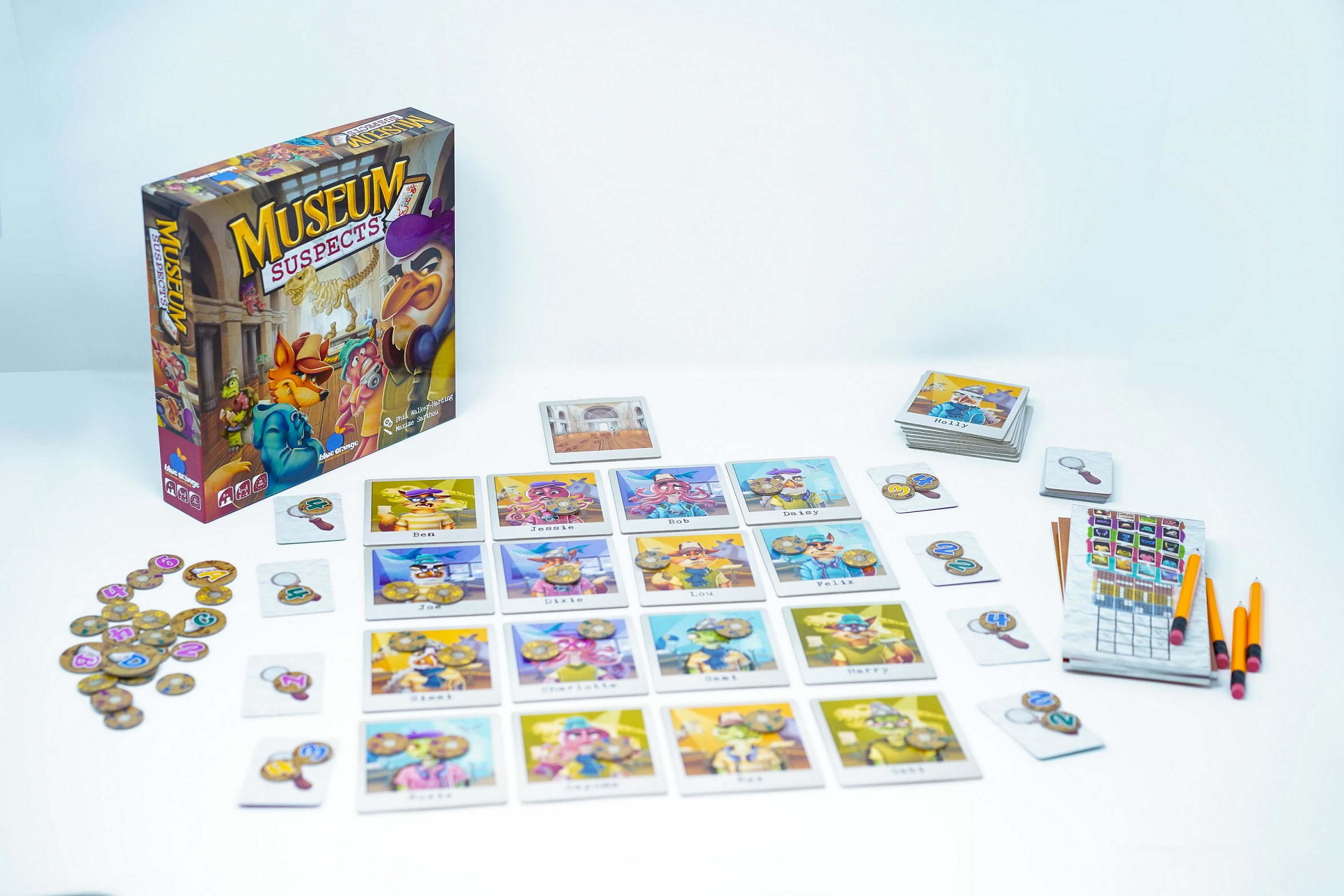 24個嫌疑犯板塊、1個緊急出口版塊、32張線索卡片、48個調查標記、4個偵探標記、4本筆記本、4枝鉛筆